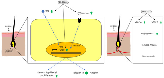 Wnt signaling in DP cells plays an essential role in regulating hair-follicle morphogenesis, differentiation, and follicle regeneration. EF-2001 is considered to affect Wnt10b expression and may contribute to new hair growth (Figure 5).