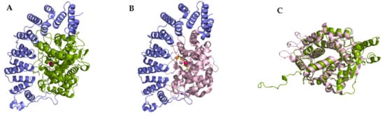 Overall structures of FTase (A) (PDB: 1FT1) and GGTase-I (B) (PBD: 1N4P), with the α subunit shown in blue, the FTase β subunit in green, and the GGTase-I β subunit in pink. The catalytic zinc ion is shown in red. Superposition of β subunit of FTase and GGTase-I (C). (Created in the PyMOL Molecular Graphics System, Version 2.5.2 Schrödinger, LLC.).