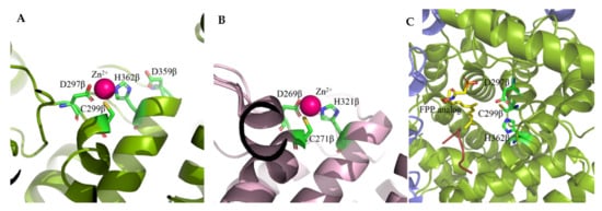 A single Zn2+ ion bound to the β subunit is present near the interface of the subunits and is coordinated by three conserved amino acid residues, Asp, Cys, and His (Figure 3). In FTase, Asp297β and Cys299β located in the N-terminal region of the loop surrounding the 11β helix, His362β in the 13β helix, and a water molecule are involved in Zn2+ coordination [32,34,35]. Asp359β was also shown to be involved in the binding of Zn2+ [35]. In the case of GGTase-I, Asp269β, Cys271β, and His321β bind Zn2+ [33]. The zinc ion is necessary to maintain proteins’ enzymatic activity and coordinate the cysteine thiol of the CAAX substrate or the thioether group in the product. In substrate complexes, the CAAX cysteine thiol(ate/ether) forms a short (2.3 Å) connection with Zn2+ and a longer (2.6 Å) interaction in the product complex [7]. Zinc is also not required for FPP binding, as revealed in the structure of the rat FTase lacking this ion in complex with the FPP analog and the peptide derived from K-Ras4B (CAAX motif—CVIM, PDB: 1D8E) [36]. Unlike GGTase-I, Mg2+ ions are key factors for the enzymatic activity of FTase. The binding of Mg2+ ions at the millimolar level increases the reaction rate 700-fold, possibly reducing the gap between the reacting partners [37,38]. Mg2+ interacts with phosphate groups of FPP and Asp352β. In GGTase-I, the Lys311β residue serves as the equivalent of Asp352β in FTase and its positively charged side chain enables stabilization of the diphosphate group [39].