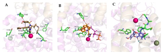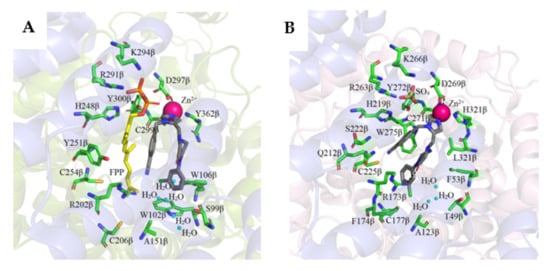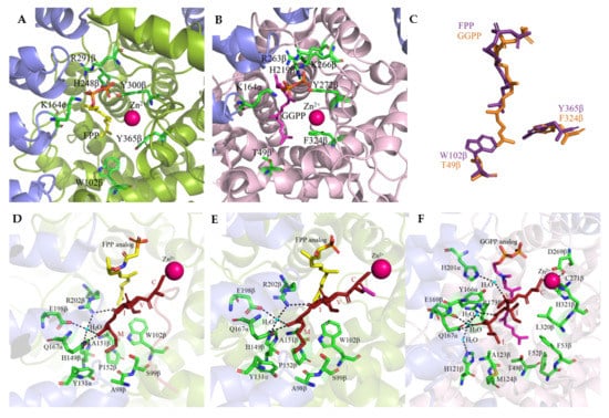 Based on the high-resolution crystal structure of FTase with an FPP substrate (PDB: 1FT2) [40] and GGTase-I with GGPP (PDB: 1N4P) bound at the active site [33], it was shown that the binding sites for isoprenoid substrates are located in the cavity of the β subunit α–α barrel. This pocket has an inside diameter of 15 to 16 Å and a depth of 14 Å. In the case of FTase, the cavity contains ten highly conserved aromatic residues with which the isoprenoid interacts: Trp (102β, 106β, 303β), Phe (253β, 302β), and Tyr (105β, 154β, 205β, 361β, 365β). The farnesyl residue of FPP binds in an extended conformation interacting with conserved aromatic residues. Arg202β in the α helix 7β is positioned in such a way that allows it to interact with the phosphate residue of the substrate. After the FPP molecule is introduced into the pocket, the diphosphate group can interact with the zinc atom. In the GGTase-I active site, the first three isoprene units of GGPP bind similarly, while the fourth isoprene residue is inverted ~90° to the rest of the molecule. Introducing a GGPP molecule into FTase is not possible due to the presence of large amino acid residues such as Trp102β and Tyr365β in the depth of the binding pocket. In GGTase-I, their counterparts are the smaller Thr49β and Phe324β residues facilitating the binding of the fourth isoprene unit (Figure 4). The positively charged cleft is adjacent to the catalytic zinc ion and runs parallel to the α–α barrel near the subunit interaction surface and is limited by the twist connecting the 4α and 5α helices and the loops connecting the 8β–9β, 10β–11β, and 12β–13β helices. The diphosphate moiety of the FPP and GGPP molecules forms hydrogen bonds in a positively charged cleft with Lys164α, His248β, Arg291β, and Tyr300β in the case of FTase and Lys164α, His219β, Arg263, and Tyr2726ββ, Lys266β in GGTase-I.