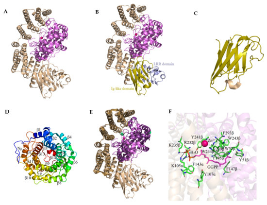 Overall structures of Rab geranylgeranyltransferase, with the α subunit shown in beige and β subunit in pink (A) (PDB: 1DCE). Representation of the RGGT structure, with three domains of the α subunit shown in different colors (beige, the α-helical domain; yellow, the Ig-like domain; blue, the LRR domain containing leucine-rich repeats) (B). The labeled strands of the Ig-like domain (C). The β subunit of RabGGT, and the helices numbered β1–β14 and in different colors (D). Superposition of 1DCE (beige, α subunit; pink, β subunit) and 3DSS (brown, α subunit; violet, β subunit) (E). The crystal structure of RGGT in complex with geranylgeranyl pyrophosphate (F) (PDB: 3DST). The zinc ion is shown in red. (Created in the PyMOL Molecular Graphics System, Version 2.5.2 Schrödinger, LLC.)