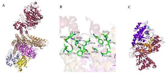 Thus far, it has not been possible to obtain a complete complex crystal consisting of all the elements involved in the geranylgeranylation of Rab proteins, i.e., RGGT, GGPP, and REP associated with a protein substrate or product (prenylated Rab protein). The interactions between individual components are known based on the structures of partial complexes, which also allowed the determination of the mechanism of Rab protein modification. The complex of the rat isoprenoid-bound RGGT and REP-1 with farnesyl phosphonyl(methyl)phosphonate (FPCP) (PDB: 1LTX) was solved to 2.7 Å resolution (Figure 6A). FPCP, a phosphatase-resistant analog of FPP, was used due to the failure of initial attempts to determine the structure of this complex in the presence of GGPP or FPP [44]. The complex interface between RGGT and REP-1 buries a small surface area of ca. 680 Å and is formed by the 8α, 10α, and 12α helices of the α subunit of the enzyme and helices D and E of the II domain of REP-1. The Arg290 of REP-1 participates in the formation of hydrogen bonds with the main chain of Phe220α and Thr221α RGGT, while Lys294 of REP-1 with Glu378αα of the 12α helix of the enzyme. The Met286 and Met291 of REP-1 are involved in the hydrophobic interaction with the Phe220α and Leu377α side chains of RGGT, respectively. Moreover, the side chain of Phe279 REP-1 targets deep into the cavity formed by the α helix 8α and 10α of the α subunit of RGGT. It is involved in the hydrophobic interaction with the Ile171α, Leu214α, Ala218α, and possibly Thr172α residues of the enzyme. Phe279 of REP-1 is the key amino acid responsible for forming the RGGT: REP-1 complex. The LRR and Ig-like RGGT domains do not interact with the REP-1 protein. The structure of RGGT in the complex with REP-1 is similar to that specified for the crystal of the enzyme itself. The only slight differences are conformational changes in the N-terminus of the α subunit and shifts in the positions of the α helices interacting with REP-1. In the case of the β subunit, conformational changes were observed at the aromatic amino acid residues Tyr241β, Trp244β, and His190β, which are located at the RGGT lipid binding site [44].