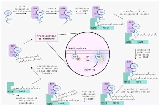 Formation of the catalytic ternary Rab:REP:RGGT complex (Figure 7) begins with the recognition of the Rab GTPase domain by the RBP region of REP. The low-to-intermediate-affinity complex is further enhanced by the interaction of the CIM region with the CBR of REP. Thus, bound Rab is made available to RGGT. The enzyme has a bound GGPP molecule in its active site at this stage. The affinity of the complex is further enhanced by the weak and largely nonspecific interaction of the C-terminus of Rab with the RGGT active site. Finally, binding the C-terminal cysteine residue to the zinc ion in the RGGT starts the reaction [43].
