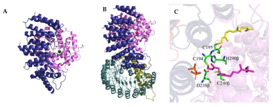 The presence of an intrinsic zinc ion in RGGT was identified, as in other prenyltransferases. It is located on the β subunit and is coordinated by Asp238β, Cys240β, and His290β. The fourth Zn2+ ligand is the His2α residue through which the N-terminal region of the α subunit interacts with the β subunit. Additionally, Lys6α interacts via ionic bonding with Asp272β. The N-terminal sequence of the α subunit also interacts with residues 283β–285β, which are part of the long loop connecting the 12β and 13β helices. The connection between the N-terminal end of the RGGT α subunit and its active site may be auto-inhibitory. It may prevent short peptide substrates from binding to the enzyme molecule. Nevertheless, the conformation of the 8α-26α amino acids is not rigid and allows the binding of the protein substrate [42].