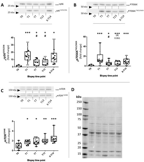 Western blotting analysis of acute responses of phosphorylated and total levels of mTOR, p70S6k, and rpS6 in human skeletal muscle during repeated RE. Regulation of prpS6S235/236 (A), pp70S6kT421/S424 (B), and pmTORS2448 (C) at rest (T0), 45 min after the 1st RE session (T1), after the 7th (T7) and 13th RE sessions (T13), and after 10 days of detraining (X-T14). Upper panel: Representative images of membranes probed for the respective proteins (phospho- and total protein). Lower panel: Box–whisker plots for the individual proteins: upper whisker (max), lower whisker (min), upper box (75th percentile), lower box (25th percentile), and median. pmTORS2448, pp70S6kT421/S424, and prpS6S235/236 were normalized to the total protein levels for each time point and individual subject. Normalization to the baseline (T0) was performed by dividing all time points of individual subjects by the total average of T0. Differently colored points represent data from individual subjects from the PR (gray dots) and CO (black dots) groups. * p < 0.05; ** p < 0.01; *** p < 0.001 with respect to T0; # p < 0.05 with respect to T1. (D) A Ponceau-S-stained PVDF membrane that was previously subjected to Western blotting and with samples of a representative subject showing all five time points.