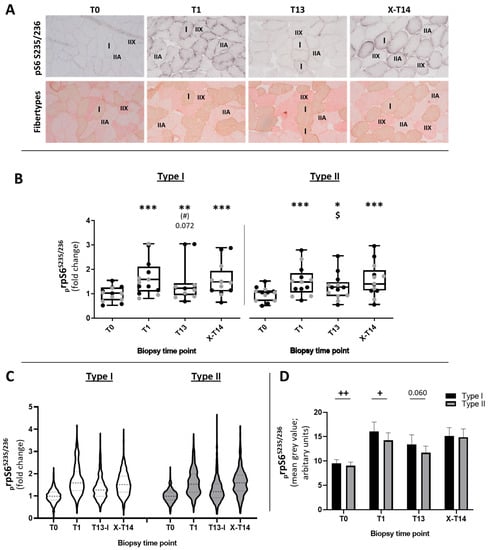 Quantification of the sarcoplasmic prpS6S235/236 staining intensity in type I and II myofibers as determined via densitometry. (A) Representative images of muscle cross-sections (20-fold magnification) from one subject stained for prpS6S235/236 (upper row of pictures) and the consecutive cross-section stained for type I (red–brown), type IIA (pale red), and IIX (full red) stained myofibers. (B) Box–whisker plots for all analyzed type I and II myofibers stained for prpS6S235/236: upper whisker (max), lower whisker (min), upper box (75th percentile), lower box (25th percentile), and median. Fiber-type-specific prpS6S235/236 data were normalized to the baseline (T0) by dividing all time points of individual subjects by the total average of T0. Differently colored points in the graphs represent data from individual subjects from the PR (gray dots) and CO (black dots) group. * p < 0.05; ** p < 0.01; *** p < 0.001 with respect to T0; # p < 0.05 with respect to T1; $ p < 0.05 with respect to X-T14 (C) Violin plots displaying the frequency of type I (white violins) and type II fibers (gray violins) with identical staining intensity of prpS6S235/236 (horizontal width of the violin corpus) and the variable staining intensity of prpS6S235/236 within the entire spectrum of analyzed fibers (y-axis). Normalization to the baseline was conducted by dividing the mean of all measured fibers of one subject and time point by the corresponding mean value of T0. (D) Direct comparison of prpS6S235/236 levels between type I and type II fibers over the time course; + p < 0.05; ++ p < 0.01 for the difference between fiber types.