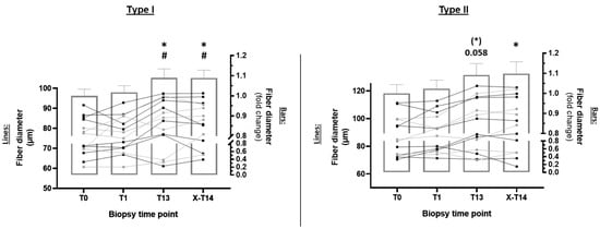 Determination of myofiber hypertrophy via analysis of type I and type II fiber diameter. Bar graphs display the mean ± standard error of the mean. The right x-axis represents the fold change in fiber diameter (T1, T13, and X-T14 compared to T0). Normalization to the baseline (T0) was performed by dividing all time points of individual subjects by the total average of T0. Lines (left x-axis) represent the absolute change in an individual subject’s fiber diameter (µm). Differently colored lines in the diagram represent subjects from CO (gray dots and lines) and PR (black dots and lines). * p < 0.05 with respect to T0; # p < 0.05 with respect to T1.