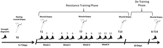 Study design. Subjects performed 14 training sessions in total within approximately six weeks. Three RE sessions per week were conducted on Mondays, Wednesdays, and Fridays until T13. Afterwards, a detraining period of 10 days without RE was conducted with a subsequent and final 14th RE session. Muscle biopsies were taken 5–7 days before the 1st (T0) and 45 min after the 1st (T1), 7th (T7), 13th (T13), and 14th (X-T14) training sessions.