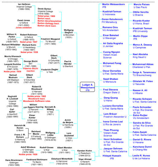 Ludger Wessjohann’s academic family tree; only some of the Ph.D. students and postdoctoral fellows he has hosted and supervised and who eventually became university professors are considered; all researchers associated with him would exceed the limits of this compilation.