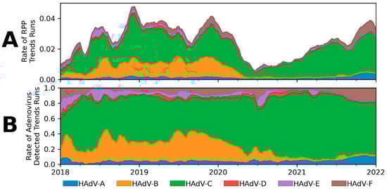 Figure 1A shows the optimized classification model applied to the RPP runs in Trends with an Adenovirus “Detected” result. The rate of Adenovirus “Detected” results are displayed as a rate of total RPP runs in the database. Subtypes are displayed in the stacked area under the total detections, indicating the percentage of RPP runs with an Adenovirus “Detected” result attributed to each species. Figure 1B shows the normalized percentage of each HAdV species from Figure 1A.