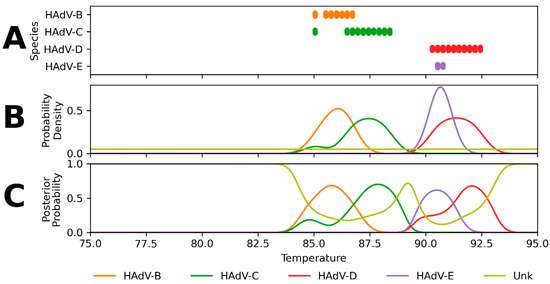 As an illustration of the methods, Figure 2 shows the progression from the estimated Tm values of expected reactive sequences (Figure 2A) to the likelihood distributions (Figure 2B) and subsequent posterior probability distributions (Figure 2C) for the RPP HAdV-5 assay. For a Tm value, each posterior probability describes the probability that the sample is of a particular species. Note that for each Tm value in the melting curve analysis range, the posterior probabilities for all species sum to one. Analogous figures for the other four HAdV assays (RPP HAdV-1, RPP HAdV-2, RPP HAdV-3, and RPP HAdV-4) can be found in Appendix A, Figure A1, Figure A2, Figure A3 and Figure A4.