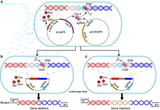 Currently, there are three mainstream genome–editing tools, namely zinc finger nucleases (ZFNs) [], transcription activator–like effector nucleases (TALENs) [], and the RNA–guided CRISPR (clustered regularly interspaced short palindromic repeats)–Cas (CRISPR–associated) nucleases systems []. However, the ZFNs and TALENs systems are difficult to use and are lab– and cost–consuming []. Due to the advantages of simple design, low cost, high efficiency, good repeatability, and short cycle, CRISPR–Cas systems are becoming the most widely used genome–editing technology in recent years []. CRISPR–Cas technologies have enabled efficient programmable gene editing in a variety of eukaryotes and prokaryotes [], such as mammalian cells [], nematodes [], and E. coil []. By base–pairing between the 5′end of a single guide RNA (sgRNA) and the target DNA [], the Cas9 DNA nuclease and sgRNA complex can accurately cleavage the targeted locus in the genome, generating a double–stranded DNA break (DSB) (Figure 1a). The main concern about using CRISPR/Cas9 is the rational sgRNA design, and previous experiments showed that some sgRNAs were less efficient or even inactive [,]. Another concern is about the off–targeting effect [], which may lead to further mutations being introduced in undesired genomic locations []. The off–target mutations are commonly due to PAM and sgRNA mismatches. Currently, various bioinformatics tools have been developed to help predict and reduce off–target modifications [,,,,]. The DSB can be repaired by either nonhomologous end–joining (NHEJ) [] or by high–fidelity homology–directed repair (HDR) [], leading to accurate gene editing by giving the homologous repair template (Figure 1b,c). Due to a lack of the repair pathway of NHEJ, bacterial cells with DSB can survive after homologous recombination.