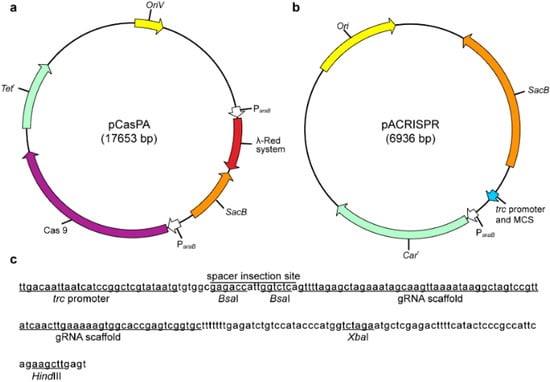 Next, another plasmid pACRISPR (Figure 2b) was used to express the sgRNA which was driven by the well–studied strong promoter trc []. The pACRISPR plasmid contained two seamless cloning sites, BsaI (Figure 2c), and we used the Golden Gate assembly [] to insert a 20–nt spacer sequence within the BsaI site; the XbaI and HindIII sites (Figure 2c) were used for the assembly of homologous repair arms by the Gibson assembly []. In addition, the lethal gene sacB, conferring sucrose sensitivity, was introduced into the two plasmids as a counter–selectable marker to facilitate rapid plasmid curing after genome editing [].