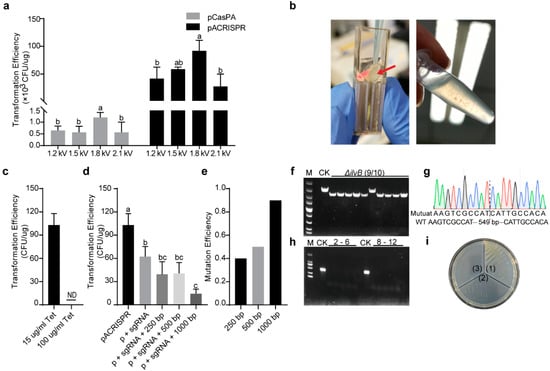 We next transformed 1 μg of pCasPA plasmids into the P. fulva native strain for a single transformation reaction, which yielded approximately 103 colonies. After the induction by L–arabinose for 2 h, the P. fulva cells containing the pCasPA plasmid were collected and prepared as the electrocompetent cells for the further pACRISPR transformation. This electroporation was also applied with a pulse strength of 1.8 kV, as described above. However, surprisingly, there was no colony growing on the agar plate, indicating the failure of the pACRISPR transformation. We also found that the competent cell became flocculent after electroporation, and bacteria lysed after 1.5 h of recovery (Figure 3b). We further tested different pulse strengths, however, the results were the same. Considering that the effects of electric fields on bacteria are also related to the physiological properties of the bacterial cells [], the high concentration of antibiotics (LB broth was added 100 μg/mL tetracycline during incubation) was used to avoid the plasmid loss in cell replication that may trigger adverse effects on bacteria, and further decrease the transformation efficiency. Therefore, we decreased the tetracycline concentration to 15 μg/mL for preparing competent cells. After electroporation, the cells were spread on LB selection plates containing antibiotics, and colonies were successfully recovered compared with the high concentration of antibiotics used (Figure 3c, indicating that P. fulva cells had double–antibiotic resistance due to the transformed two plasmids. A previous study reported that prolonged growth (>90 min) will lead to cell lysis []; interestingly, in our study, a high concentration of antibiotics used in the preparation of competent cells also caused cell lysis. Therefore, our work may also help to improve competent cell preparation from Pseudomonas native isolates.