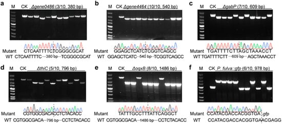 Analysis of multigene editing efficiencies using the developed pCasPA/pACRISPR system in P. fulva. The editing efficiency of (a) gene0486 (deletion of 380 bp), (b) gene4464 (deletion of 540 bp), (c) gabP (deletion of 609 bp), (d) thiC (deletion of 796 bp), (e) oqxB (deletion of 1486 bp), and (f) gfp (insertion of 978 bp) was verified by both agarose gel electrophoresis and Sanger sequencing. M, DNA marker (from up to down 5000 bp, 3000 bp, 2000 bp, 1500 bp, 1000 bp, 750 bp, 500 bp, 250 bp, and 100 bp).