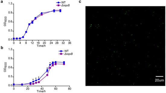 Due to higher editing efficiency when using the 1000 bp homologous repair arm, we further employed the longer repair templates for deletion of other genes, including gene4464, gene0486, gabP, thiC, and oqxB; the deletion efficiency of them were 3/10, 10/10, 7/10, 5/10, and 8/10, respectively (Figure 4a–e). In addition, since the gene oqxB was predicted to be related to the chloramphenicol resistance by ResFinder [], we used wild type and the mutant to conduct a drug resistance test. Furthermore, there was no difference between the two strains when cultured in the LB broth without antibiotics (Figure 5a). However, compared to the wild type, the growth of the mutant significantly slowed down when cultured in the LB broth containing 20 μg/mL chloramphenicol (Figure 5b), indicating that the deletion of the resistance gene affected bacterial fitness under stress conditions.