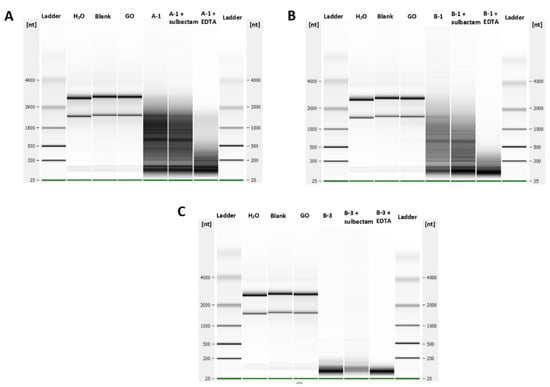 To evaluate ribonuclease activity, the RNA of each transformed E. coli was used as substrate and purified using RNeasy columns (Invitrogen, Carlsbad, CA, USA). The ribonuclease activities were performed by incubating RNA (1 µg) with 15 µg of purified putative beta-lactamase enzyme alone or in the presence of β-lactamase inhibitors (10 μg/mL sulbactam or 10 mM EDTA), in CutSmart Buffer, using a final volume of 15 µL at 37 °C for 2 h. After incubation, RNA-hydrolyzing activity was visualized on the RNA 6000 Pico LabChip (Agilent 2100 Bioanalyzer). The blank and the B. subtilis GO were also used as a negative control enzyme.
