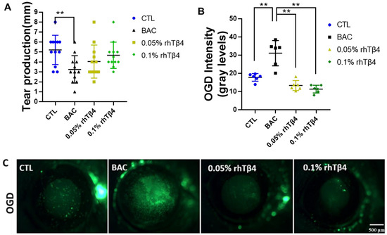 Effects of rhTβ4 on tear production and corneal barrier function in a BAC-induced DED mouse model. (A) Mean tear volumes (n = 12 eyes per group). (B) Corneal OGD staining scores (n = 6 eyes per group) and (C) representative images of corneal OGD staining. The rhTβ4 groups showed an improvement in all clinical parameters compared with the BAC group. ** p < 0.01.