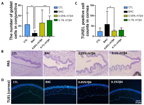 (3) rhTβ4 at 0.05% was able to provide a protective effect in the BAC-induced DED model, implying that a tiny amount of rhTβ4 would be a useful additive to eye drops containing BAC as a preservative in order to avoid DED.