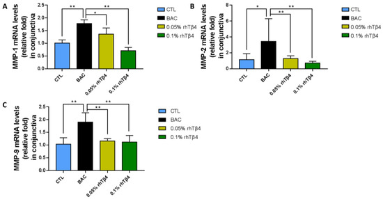 Alterations in matrix metalloproteinase (MMPs) levels have been linked to abnormal corneal wound healing and the formation of persistent epithelial defects and chronic corneal ulcers [18,19]. We also observed that BAC injury caused significant increase in MMP-1, MMP-2, and MMP-9 mRNA in conjunctiva at day 7 (Figure 3). At the same time, qRT-PCR analysis showed that rhTβ4-treated conjunctiva had decreased gene transcript levels of MMP-1, MMP-2, and MMP-9 (Figure 3A–C). The results demonstrate that rhTβ4 may promote tissue repair by processes involving matrix remodeling.