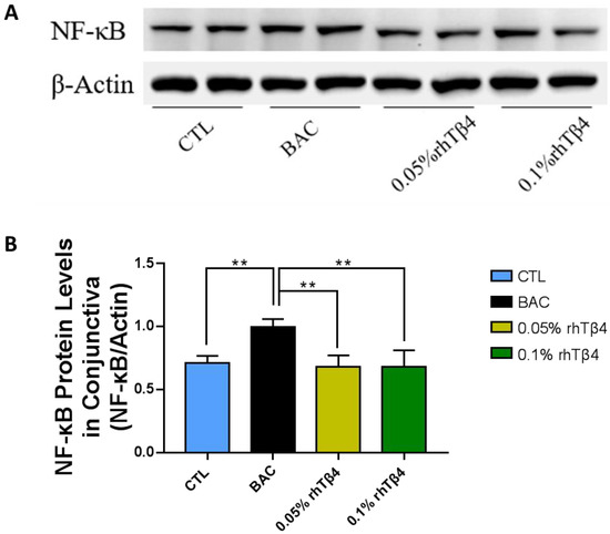 As NF-kB plays a central role in many inflammatory diseases, including ophthalmopathy, we investigated NF-kB activation in rhTβ4 treatment groups. As expected, NF-kB activation was induced in the BAC group, and was significantly reduced when treated with 0.05% and 0.1% rhTβ4 (Figure 5A,B). Notably, no greater advantage was observed in 0.1% rhTβ4 group compared to the 0.05% rhTβ4 group. Consistent with previous studies [20], these results revealed that rhTβ4 prevented the activation of NF-kB, thereby preventing the production of various proinflammatory cytokines.