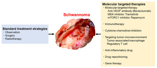 Bevacizumab has recently been considered as the first-line medical therapy for rapidly growing VS. Furthermore, new therapeutic strategies targeting the SH3PXD2A-HTRA1 fusion gene, several protein kinases, and the tumor microenvironment may be supportive for the mainstays of management. An immunotherapeutic approach may also be needed to control multiple tumor progression in the long term. In addition to the standard treatment strategy, including surgery and radiotherapy, these targeted medical therapies are needed for multiple and large tumors of VS (Figure 1). Multimodal therapy is required to manage patients with refractory VS.