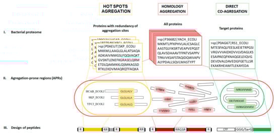Strategies for the development and design of amyloidogenic antimicrobial peptides include three steps: selection of a list of protein sequences, search in the list of APRs, and construction of a peptide. The homologous aggregation (red color) strategy [] involves searching for APRs in the entire set of bacterial proteins. A peptide designed in this way consists of a duplicate section of APRs separated by a glycine–serine linker and flanked by arginine and lysine to maintain colloidal stability. The hot spot aggregation (yellow color) strategy [] involves searching for the most common APRs in the bacterial proteome. A peptide designed in this way represents a duplicated section of APRs flanked by arginine at the ends of the sequence and separated by a proline linker. The direct co-aggregation (green color) strategy involves the preliminary selection of a target protein and the search for APRs in it. An amyloidogenic site conjugated to a CPP sequence separated by a GGSarG or GGGG type linker.