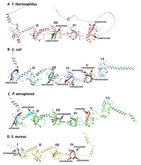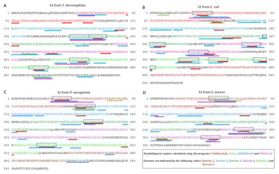 Structures of S1 proteins from T. thermophilus (A), E. coli (B), P. aeruginosa (C), and S. aureus (D) predicted by AlphaFold 2 []. The predicted and synthesized consensus amyloidogenic regions by four programs are indicated on each structure. Visualization of structures was carried out using the UCSF Chimera program [].