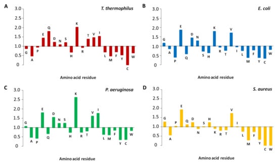 Comparison of the amino acid composition of the structures of S1 proteins from T. thermophilus (A), E. coli (B), P. aeruginosa (C), and S. aureus (D) with the corresponding bacterial proteome values.