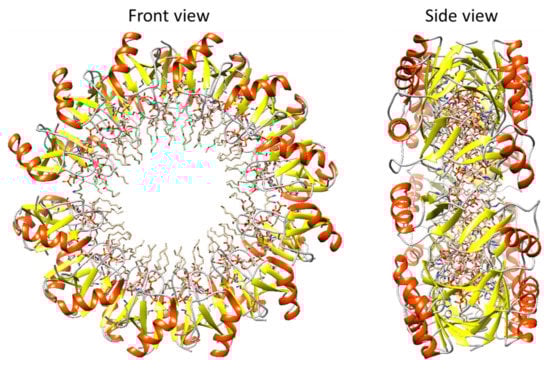 A possible ring-like oligomeric structure of plant antifungal Nicotiana alata defensin 1 (NaD1) bound to phosphatidylinositol 4,5-bisphosphate (PIP2) is shown in Figure 5. This structure consists of 24 NaD1-PIP2 units. The inner and outer diameters of this structure are about 30 and 100 Å, respectively. For the construction of this ring-like oligomer, the structure 4CQK from the Protein Data Bank was taken as a template.