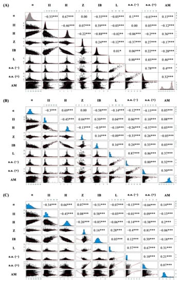 Figure 6B,C show the correlation matrices of the distribution between the physicochemical properties of AMPs and AMPs, both prone and not prone to amyloidogenicity, respectively. According to the results of the correlation distribution between the physicochemical properties of AMPs and AMPs, which are prone to amyloidogenicity (Figure 6B), physicochemical properties, such as amyloidogenicity (AM) and peptide length (L), slightly correlated, amyloidogenicity (AM) and the amount of positive a.a.(+) and negatively charged a.a.(−) amino acids. A slight correlation in this case can be interpreted by the heterogeneity of the dataset and the distribution of positive and negative charge in the AMPs. However, when comparing the correlation distributions between the physicochemical properties of AMPs and AMPs that are not prone to amyloidogenicity (Figure 6C), apart from the correlation of both amyloidogenicity (AM) and peptide length (L), amyloidogenicity (AM) and the number of negatively charged amino acids a.a.(−), it can be seen that amyloidogenicity (AM) and aliphatic index (α), instability index (II), hydrophobicity (H), charge (Z), and Boman index (IB) are weakly correlated.