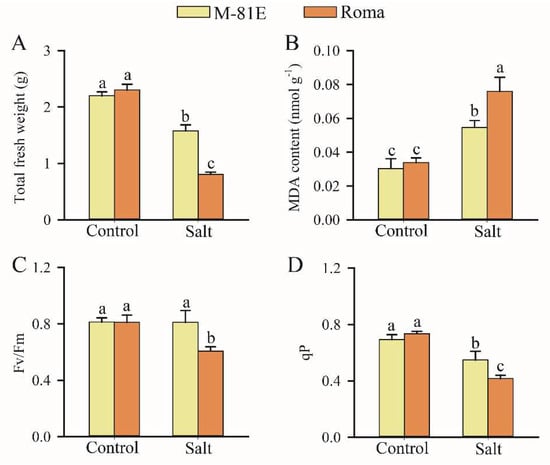 Effect of salt stress on total fresh weight (A), MDA content (B), the maximum quantum yield of PSII (C), and qP (D) of salt-tolerant (M-81E) and salt-sensitive (Roma) genotypes. Each value represents the mean of 6 replicates ± SD. Different letters indicate a significant difference (p < 0.05) between the control and the treatment.