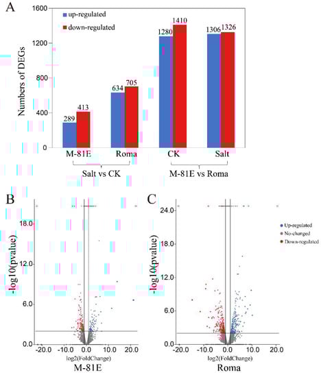 Numbers of differentially expression genes (DEGs) of different genotypes when affected by salt stress. (A) DEG distribution of the two treatment groups under normal soil or salt stress conditions; (B) volcano plot showing DEGs for M-81E+salt and M-81E; (C) volcano plot showing DEGs for Roma+salt and Roma.