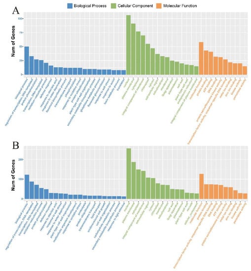 DEGs were evaluated using GO analysis to identify their functional information []. These DEGs could be categorized into three main functional classes—biological processes, molecular functions, and cellular components—using GO categories. In M-81E and Roma, 1344 and 2788 transcript sequences, respectively, were assigned to 50 s-level GO categories. These were summarized using the functional classes as follows: 15 cell components, 10 molecular functions, and 25 biological processes. For M-81E and Roma, “nucleus” was the main term of the cell component category. In terms of molecular function, “molecular_function” and “protein binding” were significantly richer terms. In terms of biological process categories, “biological_process” and “regulation of transcription, DNA-templated” were significantly enriched terms (Figure 3A,B).