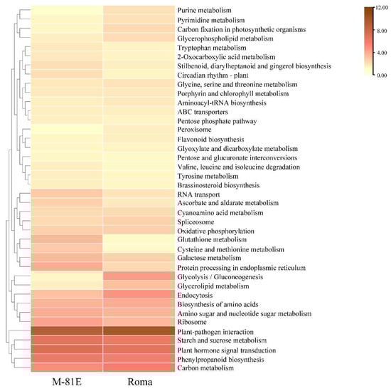 Salt stress can cause membrane lipid changes (including in membrane lipid content and signal lipid activity) and ultimately change the biological characteristics of membrane lipids []. Changes in plant membrane lipids cause lipid biosynthesis and metabolic enzyme regulation []. In this study, 25 genes were mapped to two pathways related to membrane lipid metabolism, of which 11 were mapped to glycerolipid metabolism while the other 14 were mapped to glycerophospholipid metabolism (Figure 5 and Figure S1). It can be seen in Table 1 that in the glycerol membrane lipid metabolism pathway, M-81E had six DEGs encoding three enzymes and Roma had five genes encoding four enzymes. In the glycerophospholipid metabolism pathway, 6 DEGs in M-81E encoded 5 enzymes and 10 DEGs in Roma encoded 7 enzymes.