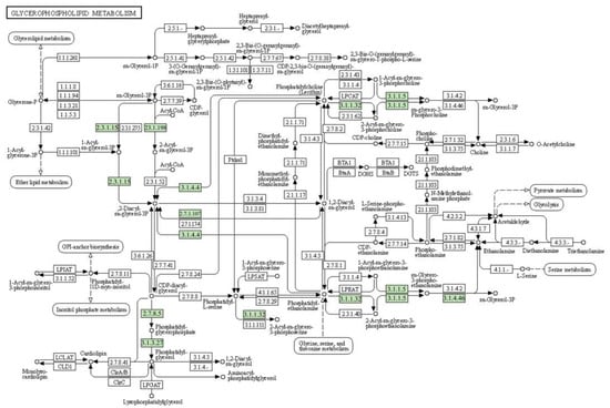 A Kyoto Encyclopedia of Genes and Genomes (KEGG) analysis was also performed on the DEGs to explore metabolic pathways in the transcriptome of sweet sorghum []. Through the analysis of DEGs, it was found that the KEGG pathway related to membrane lipids was mainly concentrated on the glycerolipid metabolism and glycerophospholipid metabolism pathways, which indicated that salt stress regulated membrane lipid metabolism mainly by affecting glycerolipid metabolism and glycerophospholipid metabolism (Figure 4).