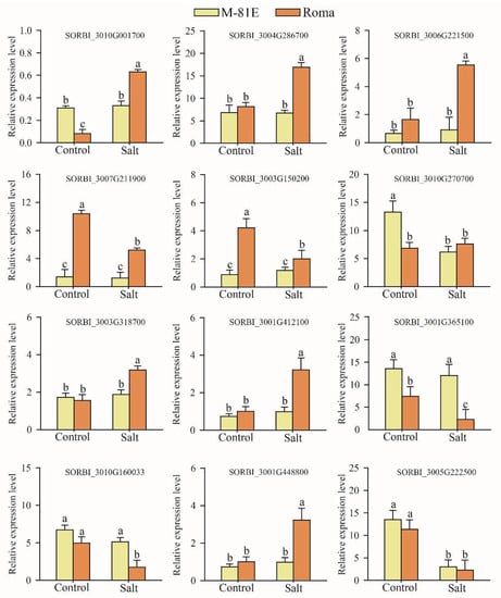 Real-time fluorescence quantitative PCR was used to verify RNA-seq results. The Beacon Designer software (Palo Alto, California, USA) was used to design the primers of 12 genes (Table S1). RNA samples of M-81E and Roma plants were prepared using a total RNA extraction kit (Huayueyang, Beijing, China) []. We used tap root tissue to isolate total RNA and a Nanodrop-ND-1000 spectrophotometer (Wilmington, DE, USA) to quantify RNA. The housekeeping gene β-actin (GenBank ID: X79378) from Streptococcus bicolor was used as an internal standard. We carried out sample preparation according to the manufacturer’s instructions. A real-time quantitative PCR instrument (Roche Diagnostics, Meylan, France) was used to perform real-time PCR. The relative expression level of each gene was calculated using the 2−△△Ct method [].