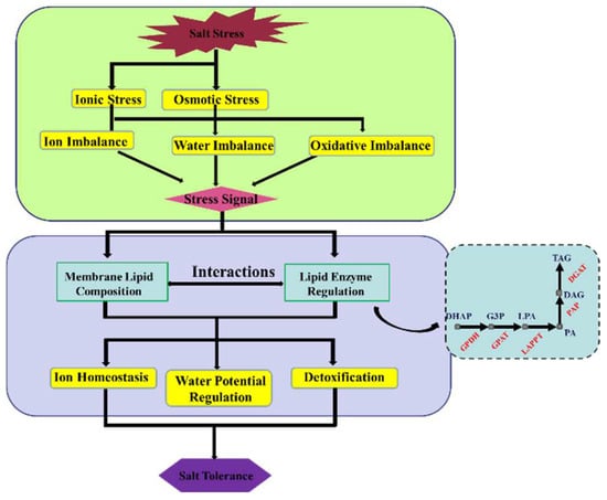 Salt stress mechanisms and membrane responsive regulations of membranes in plant cells. When a plant is subjected to salt stress, it will induce ion stress and osmotic stress, which will produce ionic, water, and oxidative imbalance signals. These, in turn, will induce membrane lipid regulation through metabolic pathways for glycerophospholipids and glycerol membrane lipids.