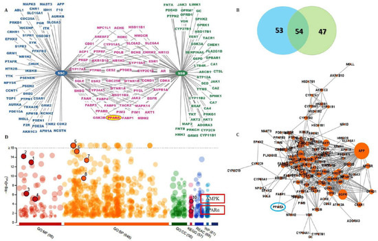 With a probability of more than 0.1, a total of 209 targets of SSC and SSB were obtained from Swiss target prediction software; further, a compound–target network was constructed and visualized using Cytoscape. As shown in Figure 2A,B, the network was established, and it consisted of 154 nodes and 515 interactions. Notably, 55 overlapped targets were present in both SSB and SSC, including the PPAR genes. This indicated that SSC could achieve the same effects as SSB in similar ways. The protein–protein interaction network (PPI) was also constructed based on common targets (Figure 2C). The main targets of PPI networks were extracted by analyzing their degree and betweenness centrality. Proteins with a degree value greater than 2 were collected. These targets may be responsible for pharmacological action against hepatic steatosis.