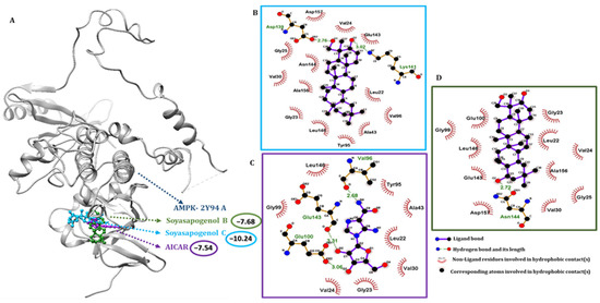 Molecular docking analysis using Auto Dock 4.2. (A) The binding interactions of soyasapogenol C (blue), soyasapogenol B (green), and the control compound AICAR (purple) with AMPK protein (grey); (B) 2D pharmacophore analysis between AMPK with active component soyasapogenol C (blue box); (C) 2D pharmacophore analysis between AMPK with control compound AICAR (purple box); (D) 2D pharmacophore analysis between AMPK with active component soyasapogenol B (green box).