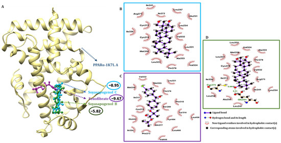 Molecular docking analysis using Auto Dock 4.2. (A) The binding interactions of soyasapogenol C (blue), soyasapogenol B (green) and fenofibrate (purple) with PPARα protein (gold); (B) 2D pharmacophore analysis between PPARα with active component soyasapogenol C (blue box); (C) 2D pharmacophore analysis between PPARα with control compound fenofibrate (purple box); (D) 2D pharmacophore analysis between PPARα with active component soyasapogenol B (green box).
