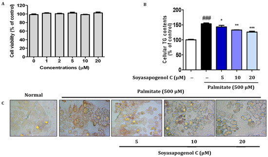 Effects of soyasapogenol C on lipid accumulation in palmitate-treated HepG2 cells. (A) HepG2 cells were treated with soyasapogenol C at various concentrations for 24 h, and cell viability was determined via Ez-Cytox assay. HepG2 cells were treated with palmitate for 24 h. (B) Measurement of intracellular triglyceride (TG) contents. (C) Lipid accumulation was determined via Oil Red O staining. Images of cells were photographed at 200× magnification. Data are presented as the mean ± SE of three independent experiments. ### p < 0.001 vs. blank, * p < 0.05, ** p < 0.01 and *** p < 0.001 vs. palmitate treated group.