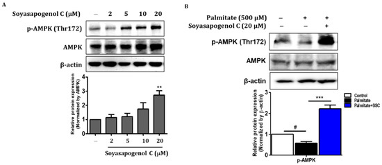 Effect of soyasapogenol C on AMPK activation in HepG2 cells. (A) Protein expression of phosphorylated AMPK was analyzed using Western blotting. (B) HepG2 cells were treated with palmitate (500 µM) and/or soyasapogenol C (5, 10, and 20 µM) for 24 h. Data are presented as the mean ± SEM of three independent expressions. ** p < 0.01 vs. normal; # p < 0.05, and *** p < 0.001 vs. palmitate-treated.