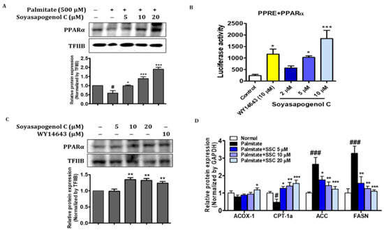 SSC increased transcriptional activity of PPARα and stimulated β-oxidation. (A) PPARα levels were analyzed in nucleus fraction using Western blotting. (B) For luciferase, the 3 × PPRE-TK-LUC plasmid and PPARα expression vector were transfected into HepG2 cells. Twenty-four hours after the transfection, the cells were treated with SSC or agonists (WY14643 10 µM) for 5 h. Values are expressed as the mean ± SEM of two independent replications. (C) PPARα levels were analyzed in nucleus fraction after treatment with SSC or agonists (WY14643 10 µM) for 24 h using Western blotting. (D) HepG2 cells were treated with palmitate (500 µM) and/or soyasapogenol C (5, 10, and 20 µM) for 24 h. Relative mRNA expression of ACOX-1, CPT-1α, ACC, and FASN. Data are presented as the mean ± SEM of three intendent expressions. # p < 0.05 and ### p < 0.001 vs. normal; * p < 0.05, ** p < 0.01, and *** p < 0.001 vs. palmitate-treated.