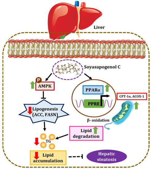 Schematic diagram representing the mechanism by which soyasapogenol C attenuates hepatic steatosis. Soyasapogenol C induced the activation of AMPK and increased the nuclear translocation of PPARα, which is associated with inhibition of hepatic lipogenesis (ACC and FASN) and stimulation of fatty acid β-oxidation (CPT-1α and ACOX-1) in HepG2 cells, thereby attenuating hepatic steatosis (↑ indicates upregulation; ↓ indicates downregulation).