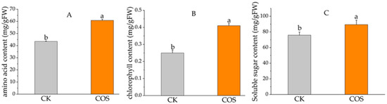 Effects of COS on amino acid, chlorophyll, and soluble sugar content. (A) Amino acid content; (B) Chlorophyll content; (C) Soluble sugar content. The value of the vertical axis represents the mean ± SD of three biological repeats. Different letters indicate significant differences at p < 0.05.