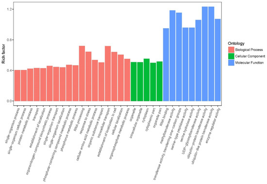 Gene ontology (GO) provides the representation of gene product attributes and covers three domains: cellular component (CC), molecular function (MF), and biological process (BP). The GO annotation for the two groups revealed that a major part of DEGs was involved in BP, and MF covered DEGs with high rich factors (Figure 3 and Table S2). The main CC categories (the parts of a cell or its extracellular environment) were “intracellular organelles” (GO:0043229), “cytoplasm” (GO:0005737)”, and “organelles part” (GO:0044422), and so on. The main MF category (the elemental activities of a gene product at the molecular level) was the expression of genes related to transferase activity at the molecular level, such as “methyltransferase activity” (GO:0008168), “transferase activity” (GO:0008168), “serine hydrolase activity” (GO:0017171), and “ubiquitin-protein transferase activity”(GO:0004842). In terms of BP, the main categories focus on metabolic processes or molecular events, such as the “protein metabolic process” (GO:0019538), the phosphorus metabolic process (GO:0006793), and the cellular amino acid metabolic process (GO:0006520).