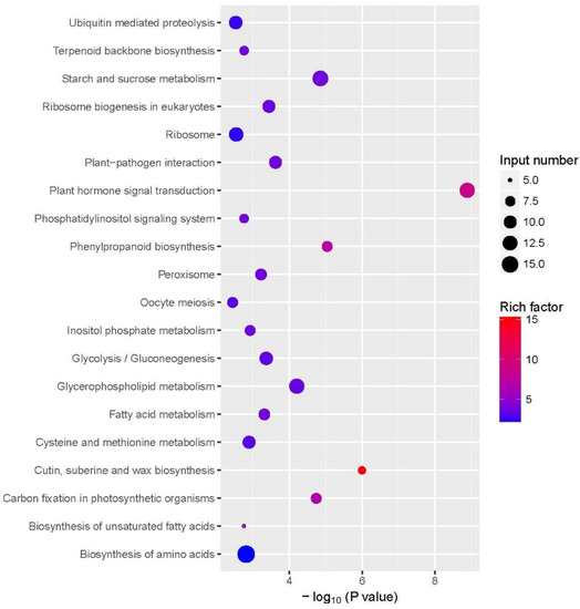 The degree of enrichment of KEGG was measured by the abundance factor, p-value, and the number of genes in the pathway. The significance of enrichment is shown on the horizontal coordinates; the greater the value (−log10 (p-value)), the more significant the enrichment. The KEGG pathway is shown on the longitudinal coordinates in Figure 4. The size of the dots indicates the number of different genes contained in the KEGG pathway, and the color of the dots indicates the degree of rich factor enrichment. These enriched pathways include “starch and sucrose metabolism” (ko00500), “glycolysis/gluconeogenesis” (ko00010), “biosynthesis of amino acids” (ko01230), “plant hormone signaling” (ko04075) (Figure 4, Table S3). The DEGs were significantly enriched in pathways for “starch and sucrose metabolism”, “phytohormone signal transduction”,“Phenylpropanoid biosynthesis”, “glycolysis/gluconeogenesis”, “glycerophospholipid metabolism”, “fatty acid metabolism”, “cysteine and methionine metabolism”, “the carbon fixation of photosynthetic organisms”, “the biosynthesis of amino acids”, “the biosynthesis of unsaturated fatty acids”, and other genes closely related to plant growth and development, which were all significantly up-regulated.