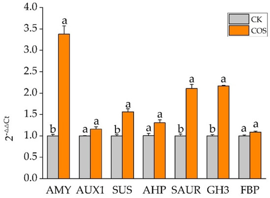 To validate the accuracy and repeatability of the transcriptome analysis, qRT-PCR (Figure 5) was performed on a set of DEGs selected randomly from the above acquired DEGs. Results showed that the qRT-PCR expression profiles were consistent with their abundance changes identified by RNA-seq (Table S1), which verified the reproducibility and credibility of RNA-seq data. Results confirmed that AMY, SUS, SAUR, and GH3 were significantly upregulated by exogenous COS.