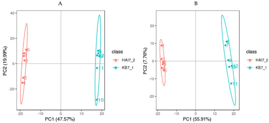Principal components analysis (PCA) of metabolites. (A) is the positive ion mode, and (B) is the negative ion mode. Red represents the samples of COS treatment (HAI7_2), and the green represents control (KB7_1).